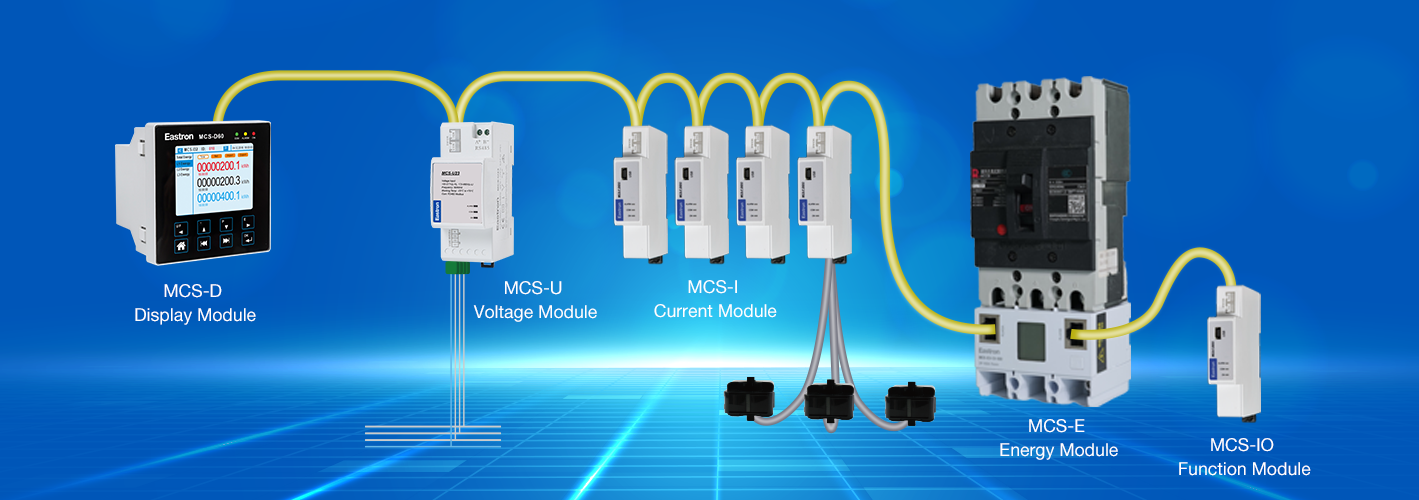 MCS-E | Strommessung (eingebauter Stromwandler) Unterstützt mehrere Verkabelungsmodi LCD-Bildschirm für lokale Anzeige | Obligatorisch (oder Mischung mit MCS-I) Muss unter Leistungsschaltern installiert werden Maximal 24 Einheiten dreiphasig oder 72 Einheiten einphasig Ideal für industrielle Szenarien |
