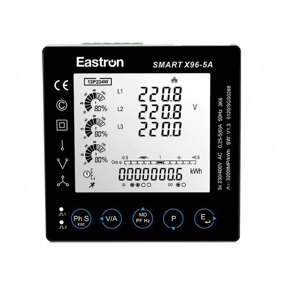 Eastron Smart X96-5A ist ein MID-zugelassener RS485-Modbus-Leistungsanalysator für Schalttafelmontage. Das Messgerät misst und zeigt die Eigenschaften von 1p2w-, 3p4w- und 3p3w-Lieferanten an, einschließlich Spannung, Strom, Frequenz, Leistung, Wirk- und Blindenergie, importierte und exportierte Energie, Oberschwingungen, maximale Nachfrage usw.
