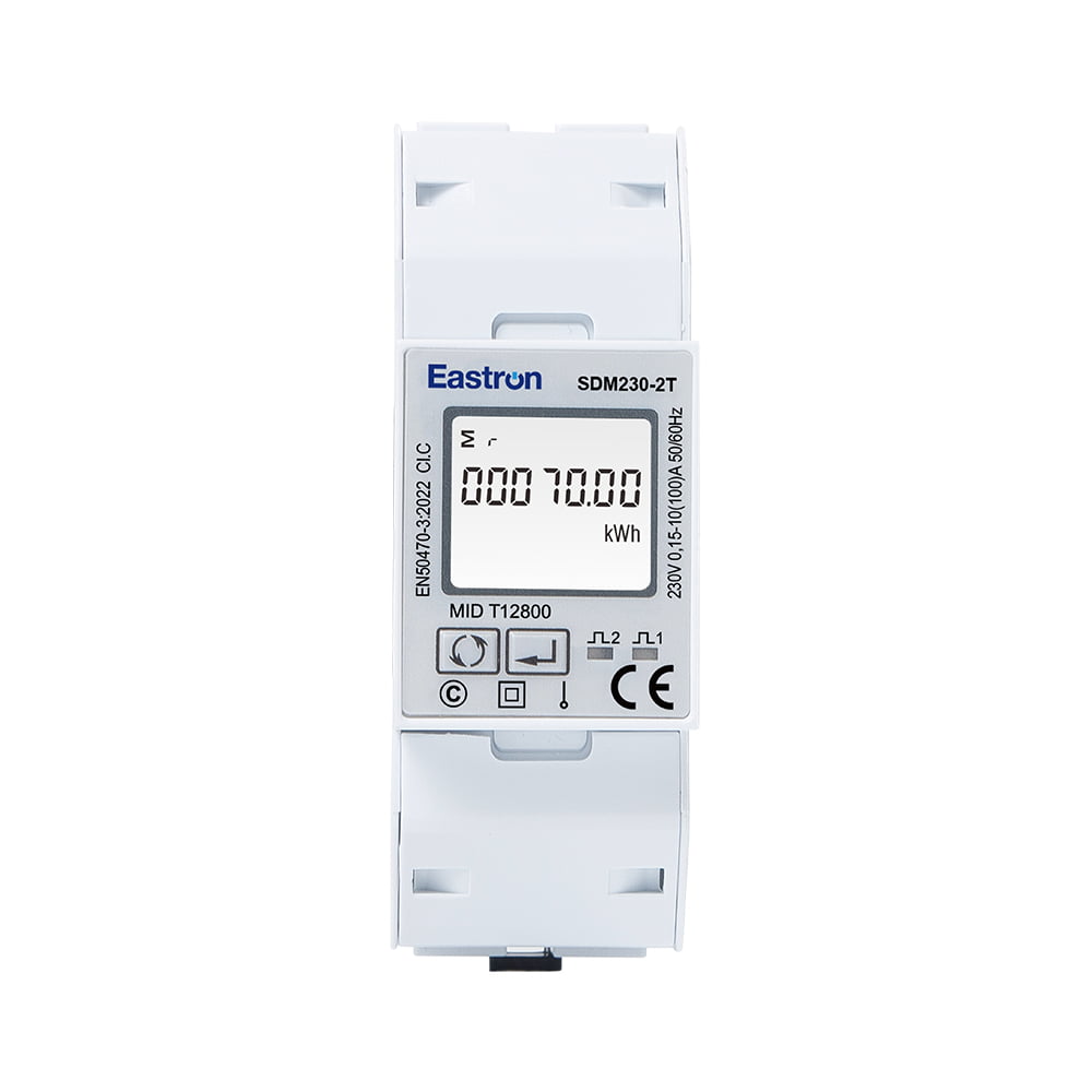 The SDM230-2T is a 100A Dual Tariff Din Rail Single Phase UL Energy Meter. It replaces 2 energy meter recording data from two different sources of energy. It provides two counters showing energy consumption on public electricity board (EB) and diesel generator (DG). The meter measures all important electrical parameters including active energy, reactive energy, current, voltage, power, power factor, frequency, etc. The units support Max. 100A direct connection, saving the cost and avoiding the trouble to connect external CTs. Two pulse outputs and 1 communication port (RS485 Modbus/DLT645) are provided for remote monitoring and setting, suitable for monitoring energy consumption in residential, solar PV, EV Charging system, industrial and utility applications.