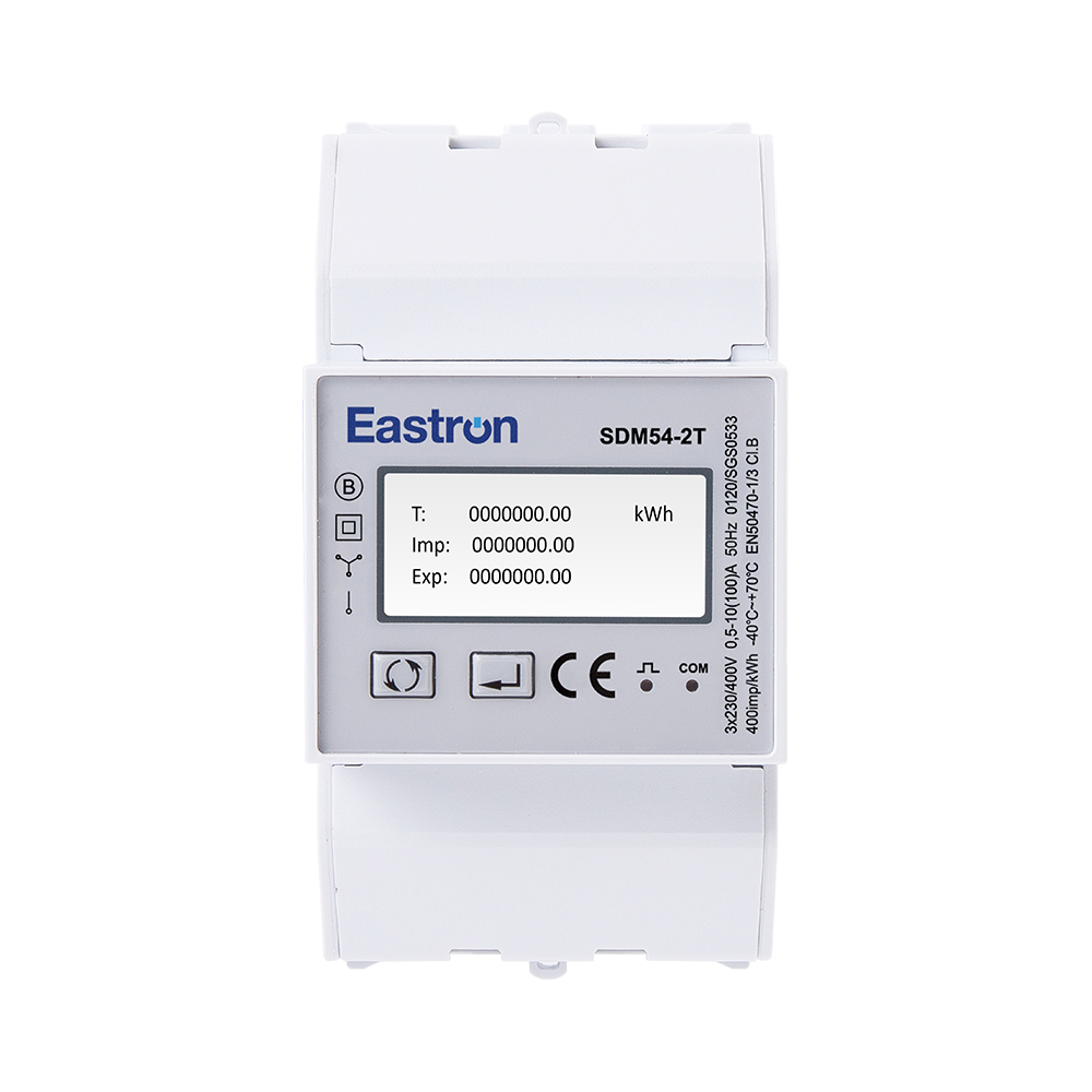 Der SDM54-2T ist ein 3-Modul-Dual-Tarif-RS485-Modbus-Din-Rail-Dreiphasen-MID-Energiezähler mit hintergrundbeleuchtetem LCD-Display. Es ersetzt zwei Energiezähler, die Daten von zwei verschiedenen Energiequellen aufzeichnen. Es verfügt über zwei Zähler, die den Energieverbrauch des öffentlichen Stromnetzes (EB) und des Dieselgenerators (DG) anzeigen. Das Messgerät misst alle wichtigen elektrischen Parameter, einschließlich Wirkenergie, Blindenergie, Strom, Spannung, Leistung, Leistungsfaktor, Frequenz usw. Die Geräte unterstützen max. 100-A-Direktanschluss spart Kosten und vermeidet die Mühe, externe Stromwandler anzuschließen. Zwei Impulsausgänge und ein Kommunikationsanschluss (RS485 Modbus/DLT645) stehen für die Fernüberwachung und -einstellung zur Verfügung und eignen sich für die Überwachung des Energieverbrauchs in Wohn-, Solar-PV-, EV-Ladesystemen sowie Industrie- und Versorgungsanwendungen.