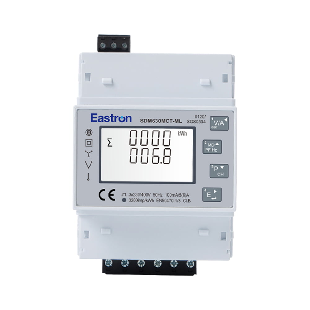 Der SDM630MCT-ML ist ein dreiphasiger Multifunktions-Energiezähler mit Vierfachlast RS485 Modbus DIN-Schiene. Geeignet zur Überwachung des Energieverbrauchs und vieler anderer elektrischer Parameter. Dieses Messgerät enthält vier Messkreise in einem Gehäuse und akzeptiert Eingänge von vier separaten RJ12-Stromwandlern. Das Gerät benötigt eine Hilfsstromversorgung (Wechselstrom oder Gleichstrom) zur Stromversorgung des Messgeräts und kann mit 100-mA-Eingangsstromwandlern betrieben werden. Die integrierte Schnittstelle bietet RS485-Modbus-RTU-Ausgänge.